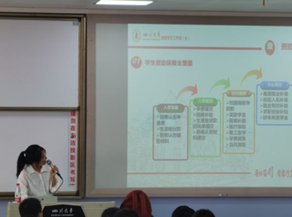 2020年9月23日,我院邀请学工部学生资助中心卢婕老师为2020级新生做资助政策宣讲。活动在江安第一教学C座407进行,2020级本科生以及新生辅导员参加活动。