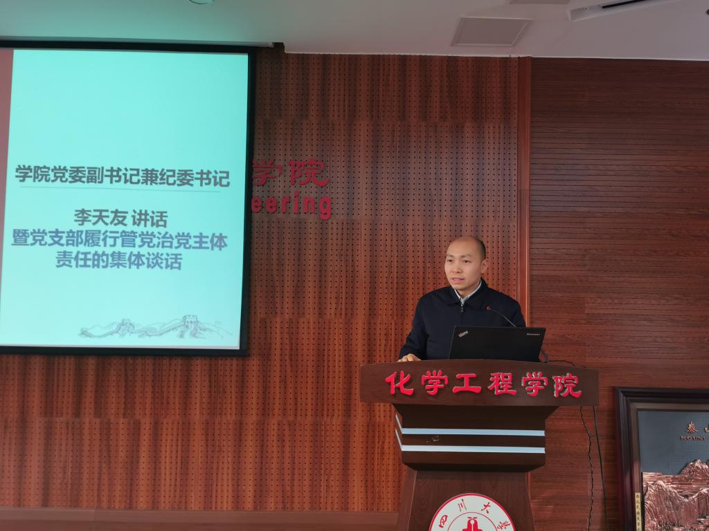 学院党委副书记兼纪委书记对参会委员们进行了党支部履行管党治党主体责任的集体谈话。他说到,全体支部委员要对照《四川大学党支部标准化规范化建设工作清单》,严格遵循《中国共产党支部工作条例(试行)》中明确的5条原则和8条任务,加强思想政治引领,筑牢学生理想信念根基,落实立德树人根本任务,保证教学科研管理各项任务完成。各党支部要树牢“四个意识”、坚定“四个自信”、做到“两个维护”,切实把抓好党支部标准化规范化建设,扛牢管党治党的组织责任,打通基层党建“最后一公里”。党支部纪检委员要明确工作职责,发挥纪检作用,推进全面从严治党向纵深发展。