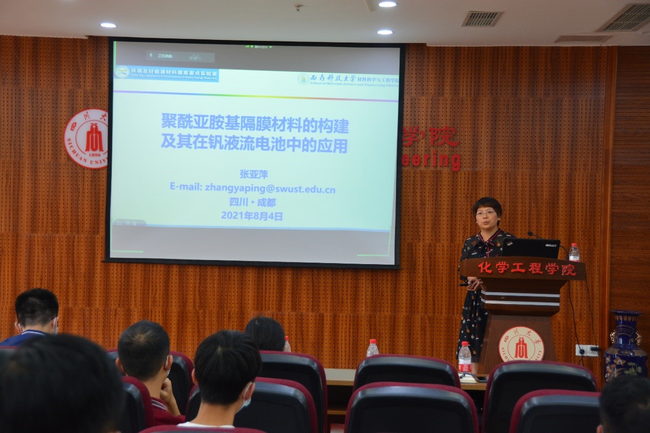 2021年8月4日下午,西南科技大学张亚萍教授应四川大学best365中国官方网站膜科学与功能材料研究室邀请,在望江校区化工学院313会议室进行了题为“聚酰亚胺基隔膜材料的构建及其在钒液流电池中的应用”的特邀学术报告,本次报告会由谢锐教授主持,best365中国官方网站和轻工科学与工程学院等50余名师生参加。
