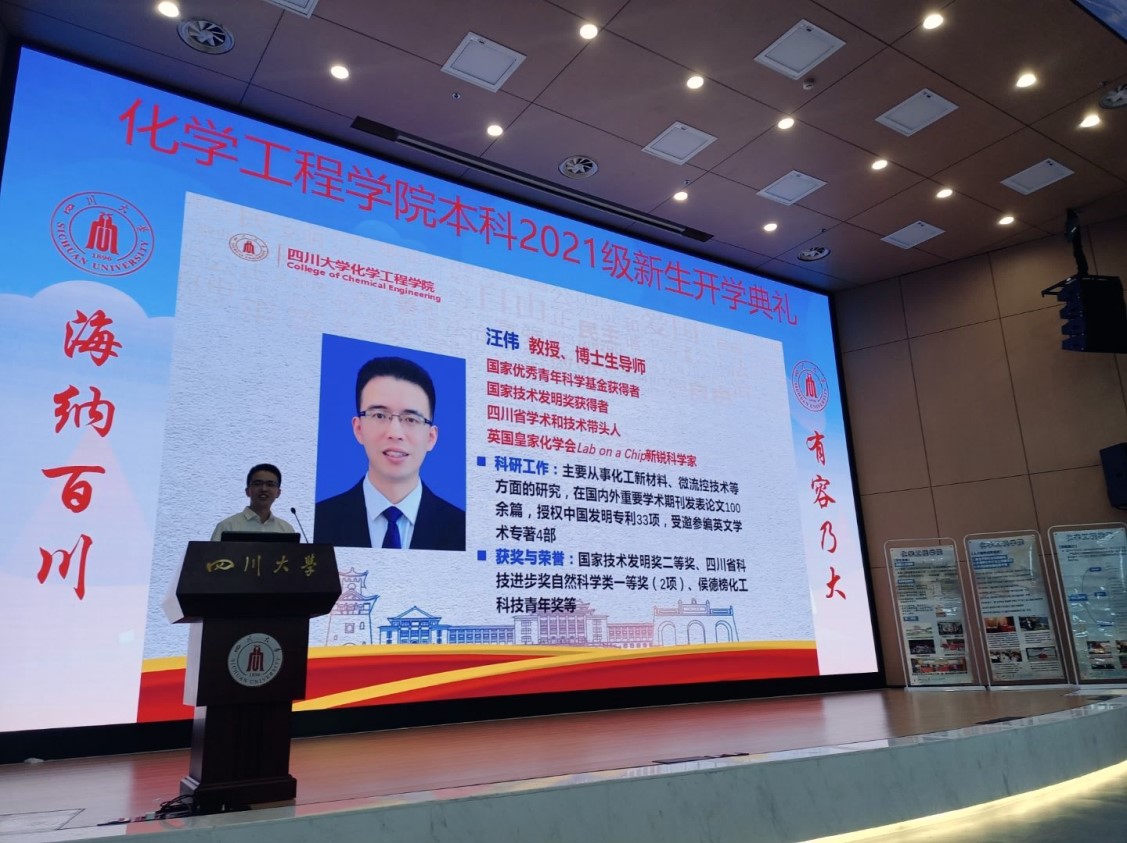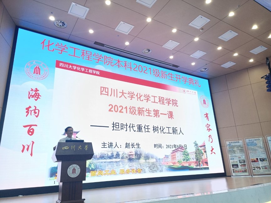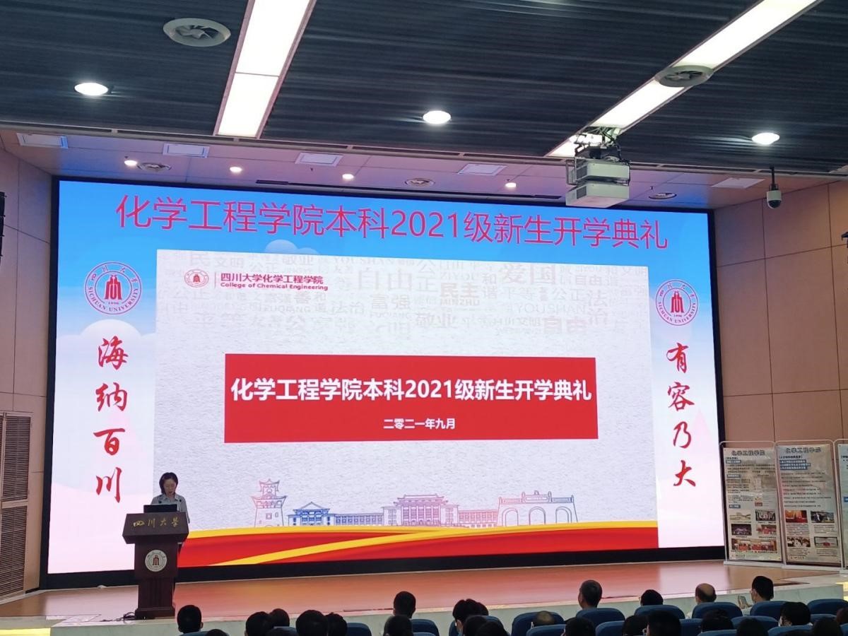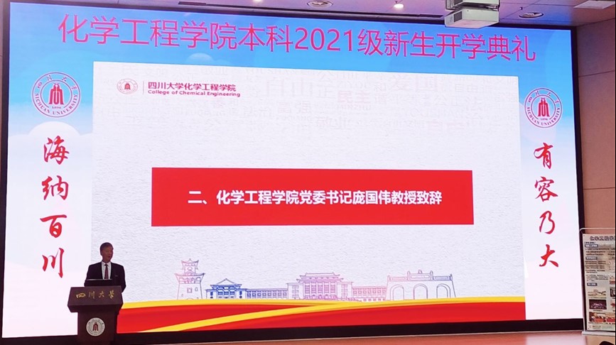 金秋时节,硕果飘香!2021年9月6日下午三点整,在四川大学江安校区水上报告厅,隆重举行了best365中国官方网站本科2021级新生开学典礼。出席本次典礼的有四川大学best365中国官方网站党委书记庞国伟,院长赵长生,党委副书记兼纪委书记李天友,党委副书记姜利寒,副院长唐盛伟、副院长钮大文,工会主席穆畅道,过程装备与安全工程系主任伍勇,制药与生物工程系主任李德富,冶金工程系主任黄青松,教师代表汪伟老师、杨秀山老师、赵强老师、岳海荣老师、谭帅老师,教导员李川娜老师,辅导员李珍珍老师、付率老师,以及2021级全体新生出席了本次开学典礼,典礼由学院副书记姜利寒主持。