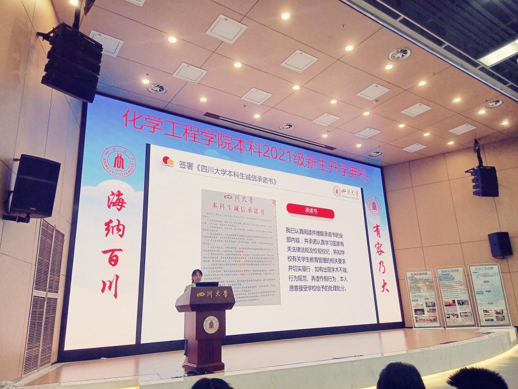 接下来,新生辅导员李珍珍,在大会上对新生分别开展了“诚信教育”,学生通过现场签署《四川大学本科生诚信承诺书》,增强了自己的学术道德规范和考风考纪意识;开展“校规校纪教育”,学生通过学习《大学生学生手册》并签署《四川大学依法治校学生承诺书》,规范了自己的纪律意识;开展“防艾禁毒宣传教育”,学生通过研读学校下发的宣传手册,强化了自我保护意识;开展“安全教育”,增强法律意识和法制观念,树立“安全第一”的思想,增强了自我防范意识;学生通过观看《逐梦青春》征兵公益宣传片,激发了“投笔从戎报效祖国”的热情。