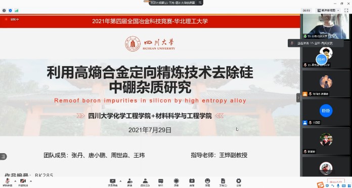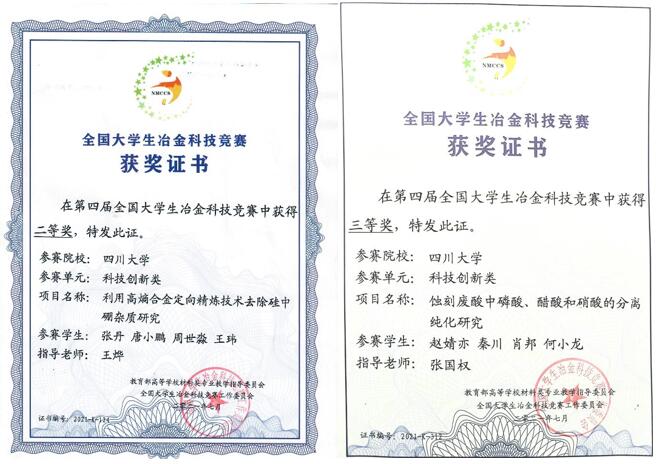 2021年7月29日,由教育部高等学校材料类专业教学指导委员会主办,华北理工大学承办的第四届全国大学生冶金科技竞赛决赛于线上成功举行。四川大学best365中国官方网站两支参赛队伍获得了一个二等奖一个三等奖的佳绩。