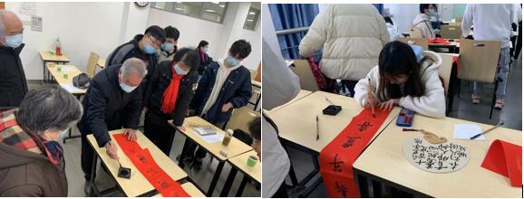 活动第一阶段,由校书画协会的两名嘉宾对书法、对联和团扇等相关的知识和典故进行了介绍,通俗易懂地向在场师生讲解了汉字的结构和当代书法派系。“书法三昧仔细分,笔法精到第一真。字法结构要合理,章法布局要均匀。”作为一种线条造型艺术,书法钩回、推出的直线与弧线带给人们心灵的沉静和美的享受,老师同学们欣赏了一场书法盛宴。欣赏完众多清新飘逸、苍劲有力的书法作品之后,老师和同学们也一起合作开始了自己的书法写作,最终,完成的作品也由同学赠送给关工委老教师以作留念。