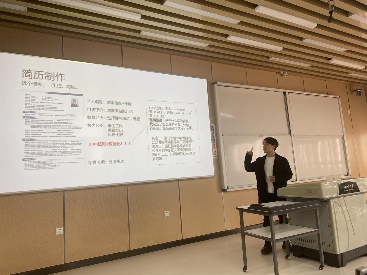活动伊始,李老师对当下的就业形势作了简单介绍,为同学们讲明了抓住本轮春招机会的重要性,并邀请到了求职、考公经验丰富的同学代表为大家分享相关经验。