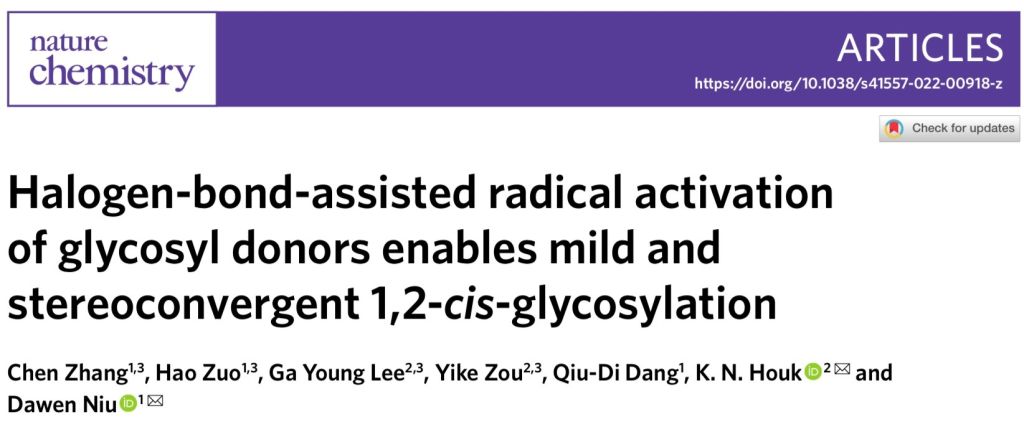 北京时间2022年4月11日晚23时,我院钮大文教授团队与加州大学洛杉矶分校Houk团队合作在Nature Chemistry上发表了一篇题为“Halogen-bond-assisted radical activation of glycosyl donors enables mild and stereoconvergent 1,2-cis-glycosylation”的研究工作[1]。我院制药与生物工程系博士生左昊同学(化工学院本硕博)为文章共同第一作者。