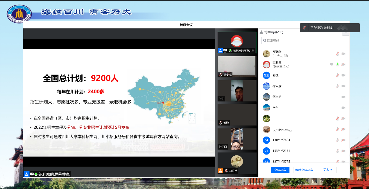 4月23日晚上18:00,best365中国官方网站面向对口负责招生地区云南省开展“2022年云南招生宣讲专场”线上直播,同时在线观看人数近300人。四川大学云南招生宣传组组长、best365中国官方网站党委副书记姜利寒组织了线上宣讲会。四川大学招生办主任兼四川大学教务处副处长张磊、四川大学网络空间安全学院教学副院长杨频在线对四川大学2022年本科招生政策进行了宣讲。