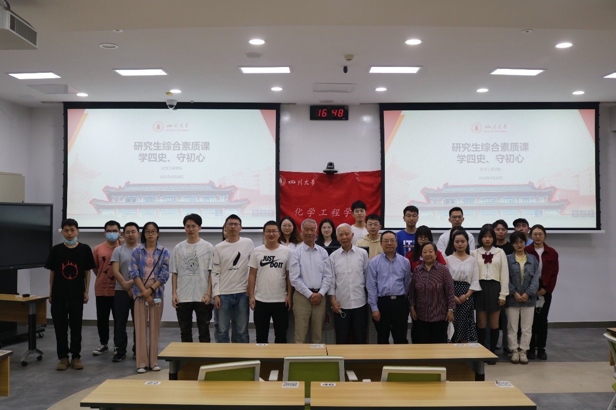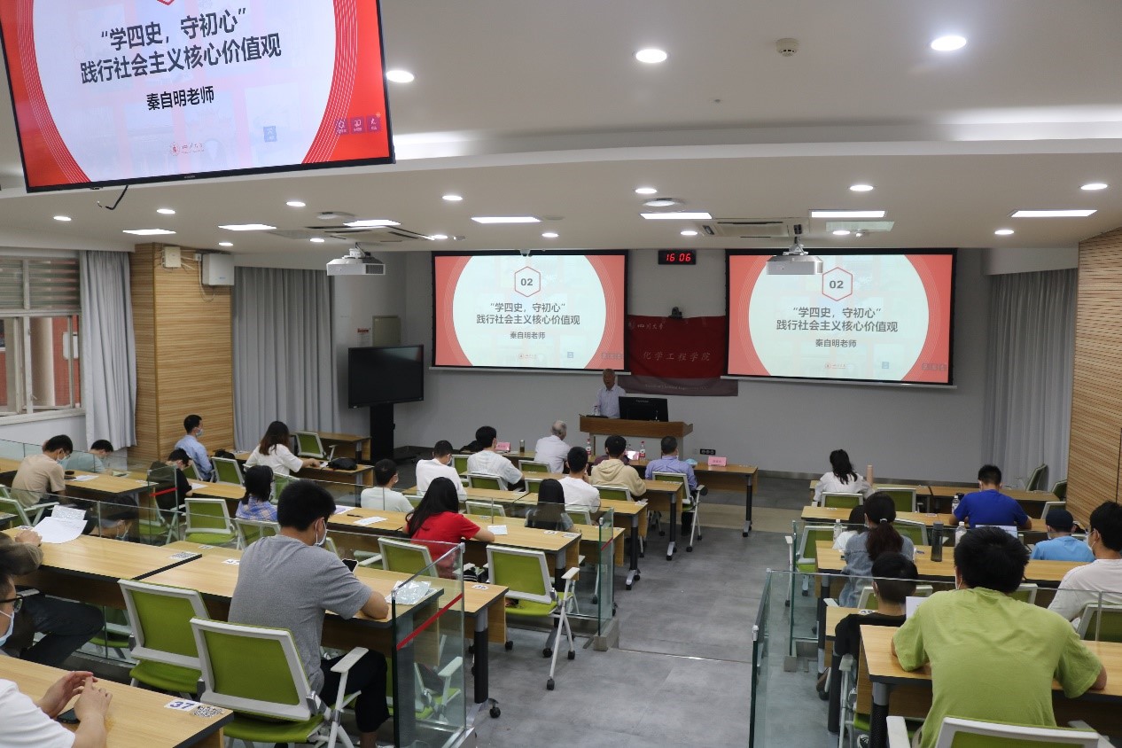 读史使人明智,历史昭示未来。习近平总书记指出,“希望广大党员特别是青年党员认真学习马克思主义理论,结合学习党史、新中国史、改革开放史、社会主义发展史,在学思践悟中坚定理想信念,在奋发有为中践行初心使命。”为响应此号召,2022年4月29日下午3点,四川大学best365中国官方网站在望江校区基础教学楼C102教室,顺利开展以“学四史,守初心”践行社会主义核心价值观为主题的教育活动,主讲嘉宾邀请了校关工委秦自明老师。校关工委梁明征老师、傅运清老师,化工学院副院长唐盛伟老师、研究生辅导员李颖丽老师以及全体2021级硕士研究生同学参加了此次活动。