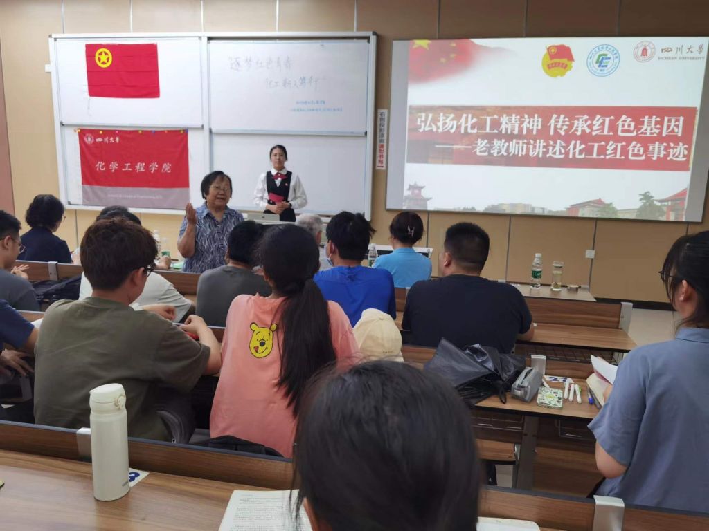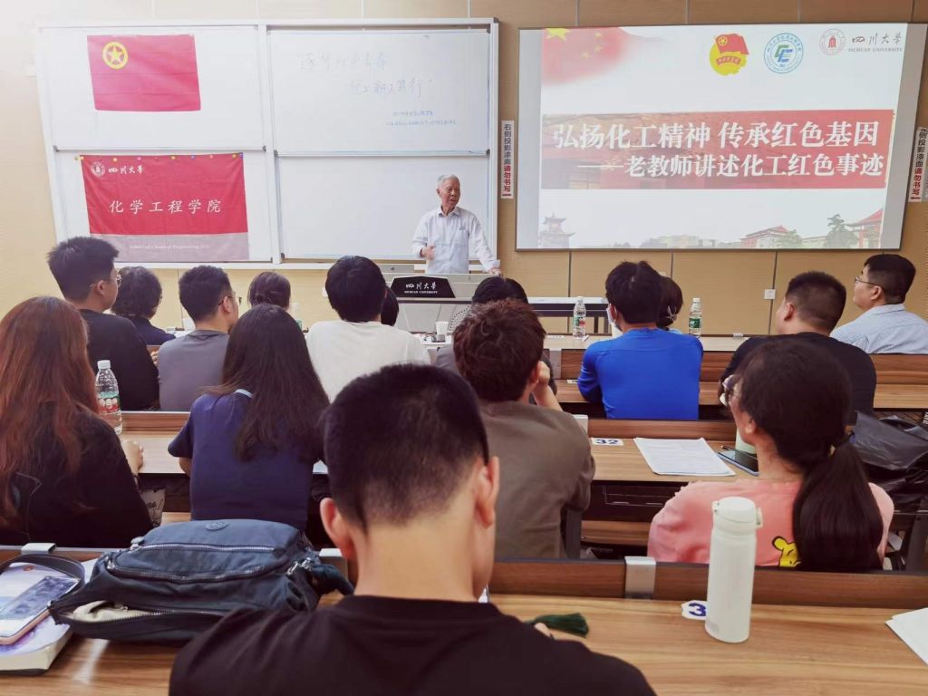 按照流程,首先邀请梁明征老师上台讲述他所听所见的化工红色事迹。梁明征老师带大家回顾了川大化工学院的历史根源,梳理了川大化工学院的前身和发展历程。随后梁明征老师为大家介绍了川大的优秀校友,同时也是杰出的革命战士毛英才的事迹,他为反抗压迫与敌人斗智斗勇的事迹令人动容。此外梁明征老师还提到了王方定,张富源等川大杰出校友,突出介绍了他们在各自领域取得的傲人成绩,并勉励在座的各位同学奋发向上,争做优秀的川大学子。