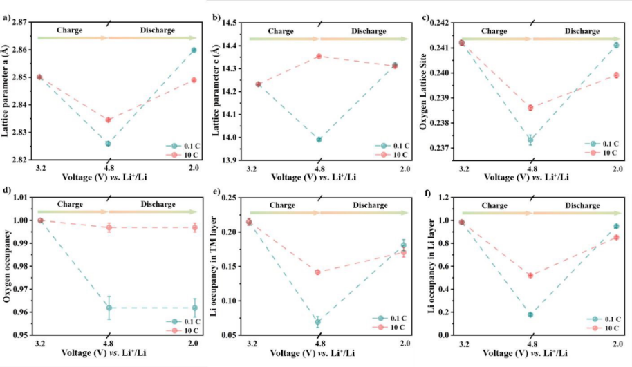 【图2】对0.1C和10C下完全充/放电状态测试结果细化:a)为晶格参数a;b)晶格参数c;c)晶格氧位置,d)氧占位率;e)在TM层中的Li占位率;f)在Li层中的Li占位率。