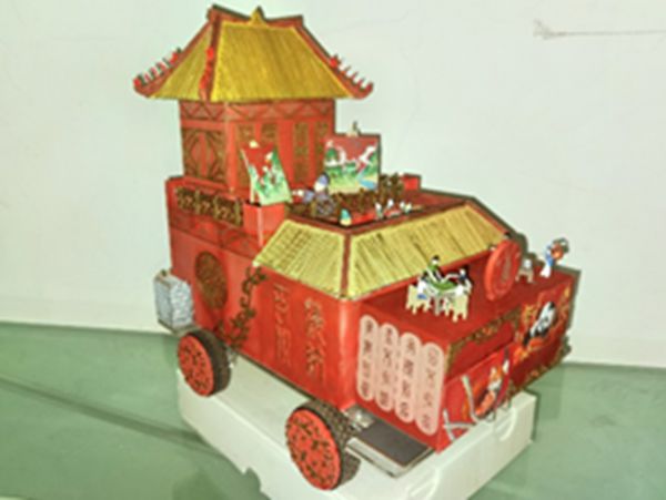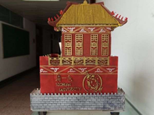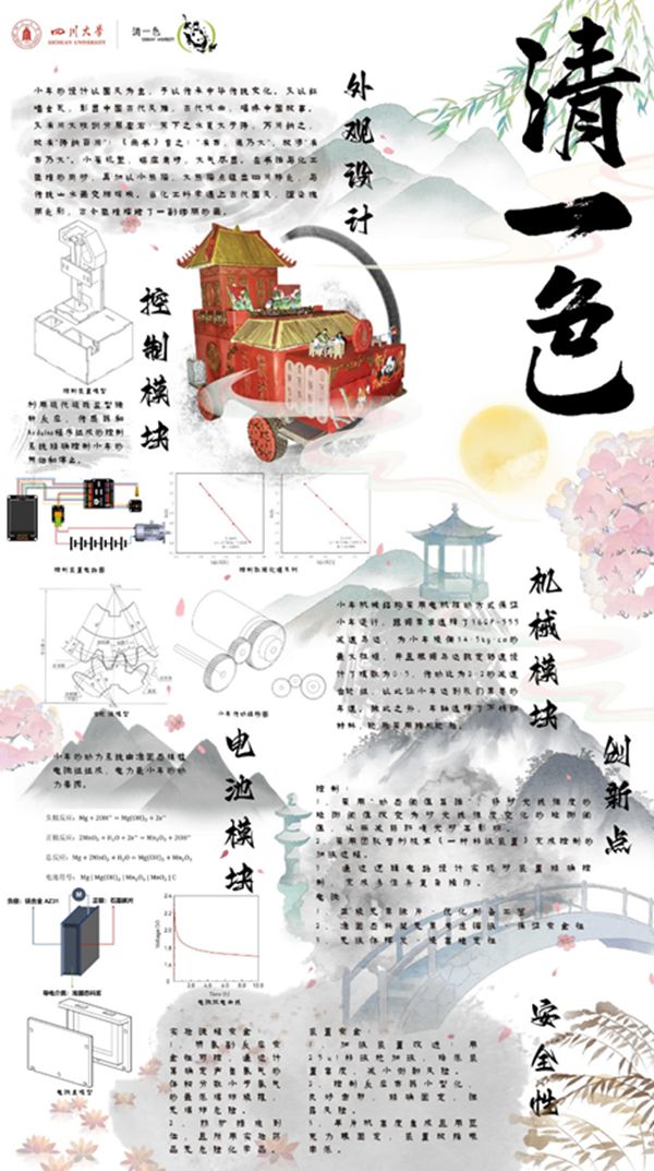 化学动力小车整体采用木制结构及红墙金瓦,彰显中国古代风雅。川大校训“海纳百川”和“有容乃大”分居左右,外壳设计上融入了巴蜀文化和国风元素,予以传承中华文化。以小熊猫、大熊猫点缀出四川特色,与传统山水画交相辉映。参赛小车以固态镁锰电池作为动力来源,以过硫酸盐型碘钟反应为控制方案,采用激光切割雕刻了小车外形,控制装置设计结合了单片机,实现了自动化取液、加液和计时,在安全性和能效上得到了评委老师们的一致认可。