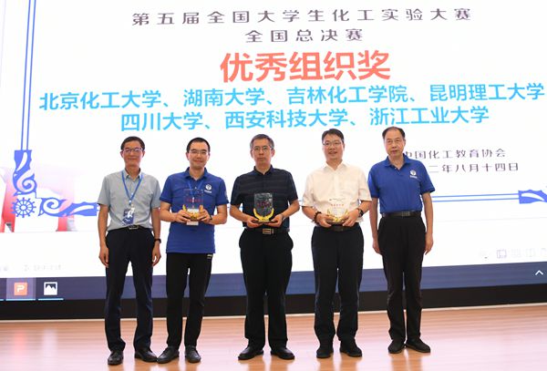 随后进行了大赛表彰环节。北京化工大学、湖南大学、吉林化工学院、昆明理工大学、四川大学、西安科技大学、浙江工业大学等7所高校获得大赛优秀组织奖;天津大学、天津科技大学、常州大学、四川大学、南京理工大学、大连理工大学等6所高校的参赛队伍获得全国特等奖;北京化工大学、湖南师范大学、武汉科技大学等26所高校的参赛队伍获得全国一等奖;中南林业科技大学、中国石油大学(北京)、西北大学等32个高校的参赛队伍获得全国二等奖。
