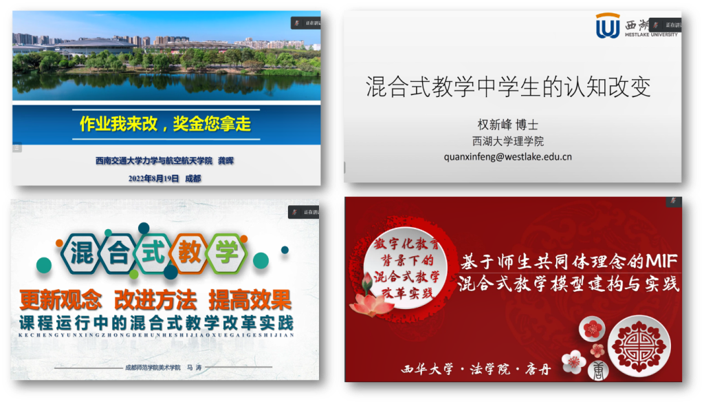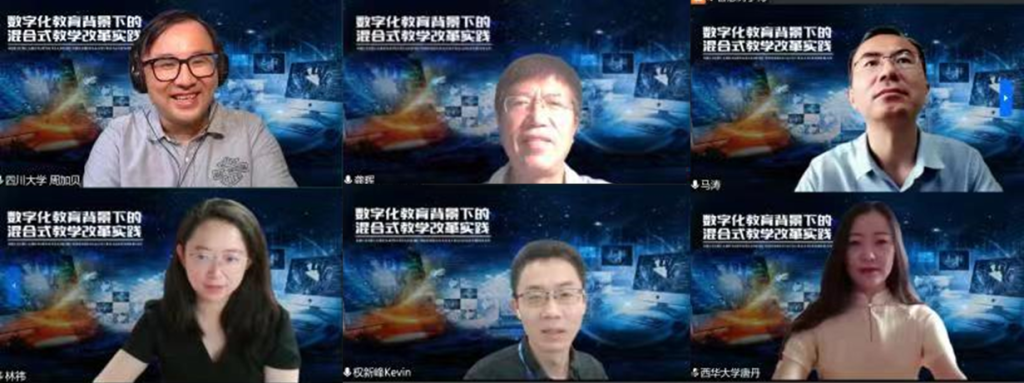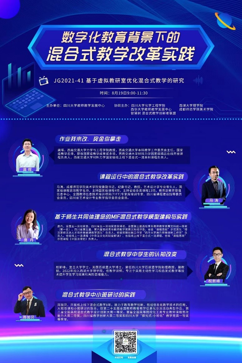 为加快高校课堂教学的变革与创新,深化数字化教育与课堂教学的深度融合及提升教师混合式教学设计与应用能力,8月19日9:00-12:00,由我院协同四川大学教师教学发展中心,与西湖大学理学院、西华大学教师发展中心、成都师范学院美术学院、智慧树平台和混合式教学创新者联盟共同举行了主题为“数字化教育背景下的混合式教学改革实践”的校际在线研讨会,共有704位校内外的教师参与研讨会,该研讨会也是省级教改项目JG2021-41基于虚拟教研室优化混合式研究的重要实践。