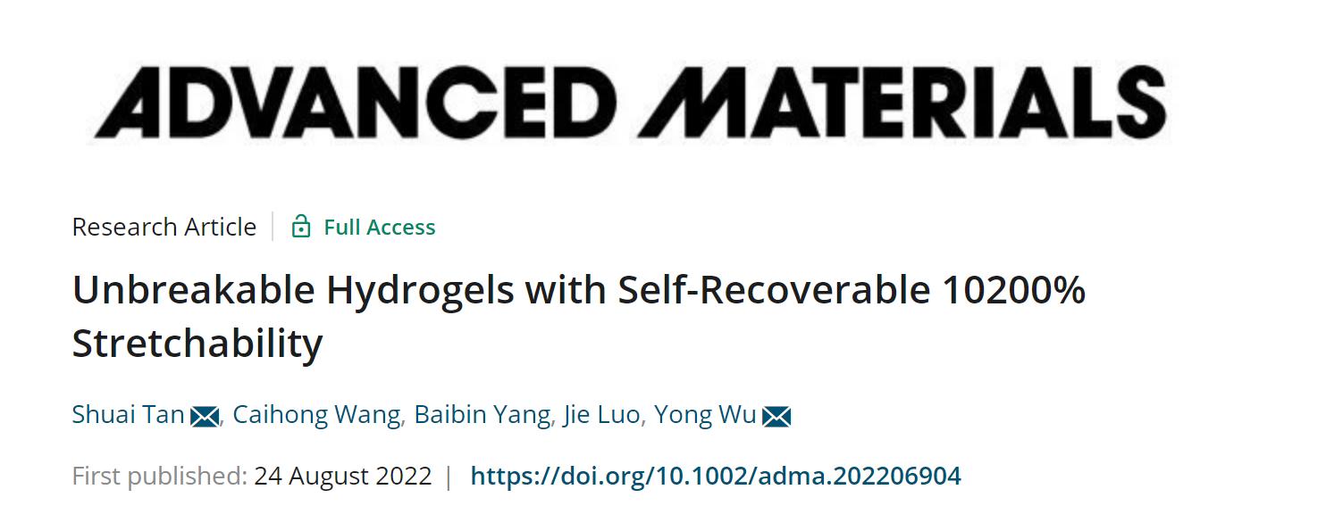 水凝胶材料在可穿戴设备、生物组织工程、传感器、软机器人等领域具有广泛的应用潜力,上述应用一般要求水凝胶能够在多变机械载荷下保持结构完整性,然而目前高性能水凝胶的设计仍难以兼顾拉伸、强度、韧性、自恢复和抗疲劳等特性。近日,我校化工学院伍勇教授/谭帅副教授提出了一种通过疏水共价交联构建高强度抗疲劳水凝胶网格的新方法,并系统的研究了水凝胶的延展性、韧性、自恢复性和抗疲劳裂纹扩张等特性,阐明了水凝胶内能量耗散的详细机制。相关研究成果“Unbreakable Hydrogels withSelf-Recoverable 10200% Stretchability”发表在《Advanced Materials》上,四川大学谭帅副教授为本文第一作者,谭帅副教授、伍勇教授为本文共同通讯作者,四川大学化工学院为本文唯一单位。
