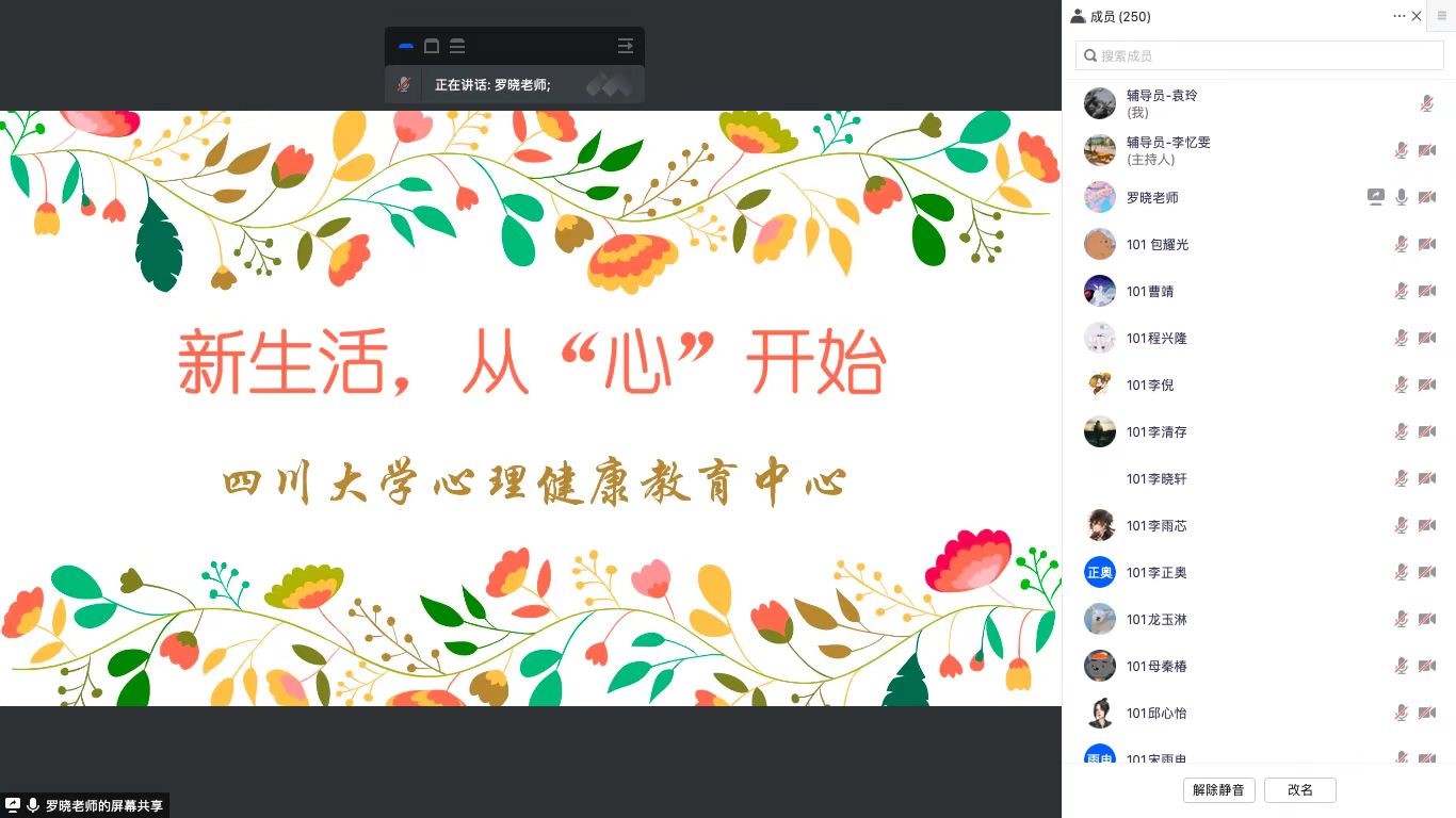 2022年9月18日上午,四川大学心理健康教育中心罗晓老师为best365中国官方网站2022级新生带来了以“新生活,从‘心’开始”为主题的心理健康讲座。因疫情原因讲座于线上举行,全体2022级新生和新生辅导员李忆雯、袁玲老师共同参与了本次活动。
