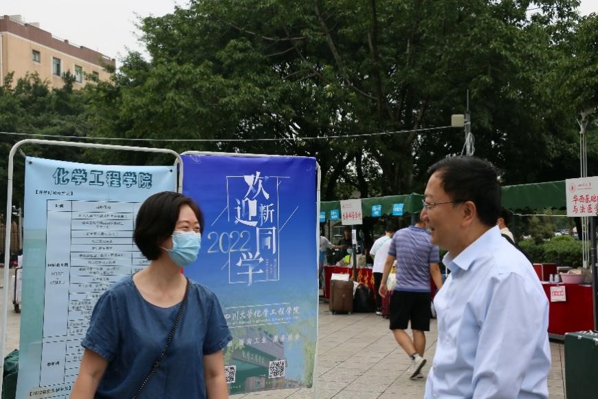 四川大学校长李言荣(右)走访新生报到点
