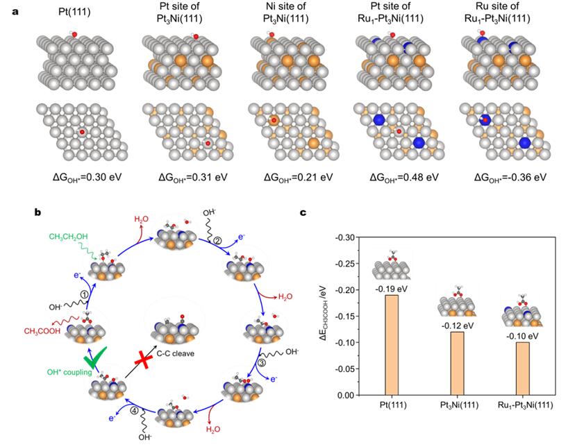 图2. (a)不同位点上的吸附羟基生成能;(b)乙醇C2路径氧化反应机理;(c)乙酸吸附能