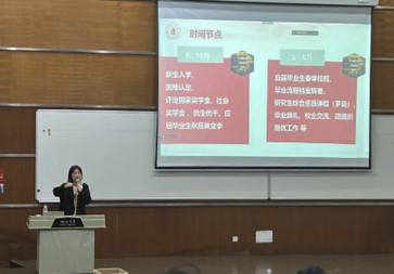 李颖丽老师首先为同学们着重介绍了学院研究生管理情况以及服务学生工作的重要时间节点,使同学们对于辅导员工作、学籍老师工作以及各系办老师的工作有了进一步的了解。同学们深刻意识到,研究生生活的有序进行,离不开辛勤工作的老师。随后,李颖丽老师向大家介绍了学校学生工作相关部门的职能以及其所在位置,如研究生院、党委学生工作部、保卫处、校医院等,给行政事务处理一头雾水的同学们指点了迷津,提高了同学们的问题解决效率并保证了同学们在必要时能够获得相应的帮助。学生工作基本情况介绍完毕后,李颖丽老师向同学们解读了《研究生手册》中的相关国家法律与校级校规,如校外住宿相关条例、学生寝室安全管理规定等内容,并提醒同学们,一定要仔细阅读《研究生手册》,尽量做到熟记,切记勿碰“高压线”。李颖丽老师补充强调了树立防诈骗意识及诚信做人的重要性,希望同学们要保护好自己的人身与财产安全,在诚信问题上“勿以恶小而为之”。最后,李颖丽老师为同学们介绍了一些常用信息获取的网址,并告诫同学们,研究生生活短暂而又宝贵,要抓紧当下,完成好学业、科研任务的同时,去积极参与社会活动与学术活动,多结识年轻的朋友,学习做人、做事的方式方法,希望同学们能够成为有追求、有梦想、具有高尚道德品质的真正的“人”。