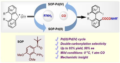 钯催化羰基化是广受学术界和工业界关注的重要反应,在构建多种实用分子中有着十分广泛的应用,通过一氧化碳的引入(羰基化过程),可将大宗化工原料,如烯烃、烷基或芳基卤化合物等,转化为醛、醇和羧酸衍生物等高价值产品。然而,经典的钯催化(零价/二价钯催化循环)羰基化,在实现高收率、高化学选择性、高区域选择性以及对映选择性等方面依然面临巨大挑战。针对此问题,廖建教授团队经过不懈努力,发展了一种以手性亚砜膦/钯络合物为催化剂,通过高价钯催化途径的不对称胺羰化新策略。
