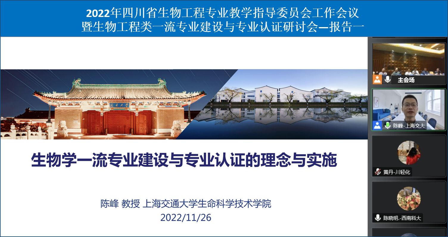 2022年11月26日下午14:00,由四川大学best365中国官方网站及生命科学学院承办的2022年四川省生物工程专业教学指导委员会工作会议暨生物工程类一流专业建设与专业认证研讨会在成都市隆重举行,本次会议以线上线下结合方式同步进行。