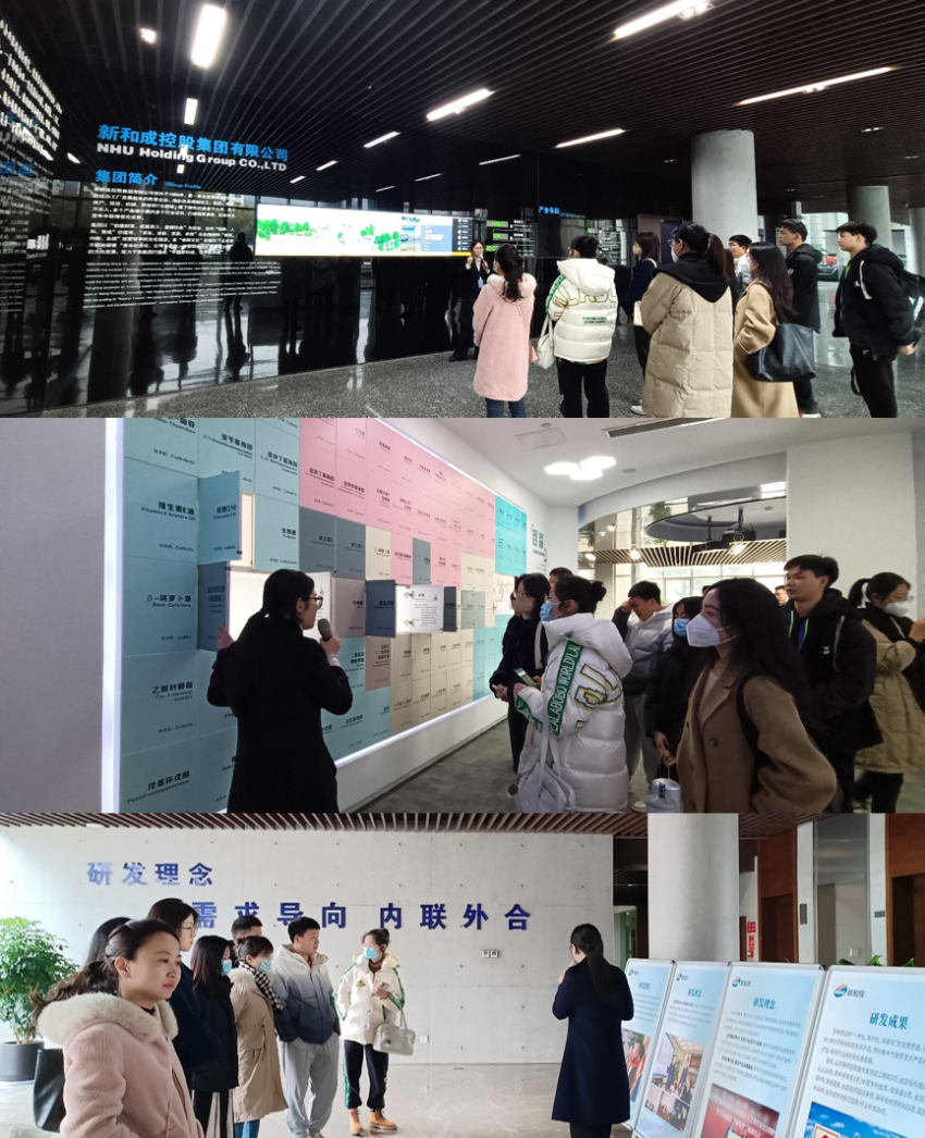 活动起始,由人事部吕梦桢简要介绍新和成公司基本情况,包括集团的发展历程、核心功能产品及应用、工厂基地分布及规模,产业方向布局等。新和成公司创办于1988年,产业涉及精细化工、医药、新材料等7大领域,多个产品填补国内多个行业空白,尤其在氨基酸、医药原料、香料香精、高分子材料等方面的生产在全球化竞争中取得领先优势。新和成集团自成立以来获得多项技术创新征程与荣誉奖项,企业提倡将培养人、关心人、教育人放在首位,倡导贤者为师能者为师、谦虚做人、精心育人的老师文化,坚持“创新、人和、竞成”的价值观,致力于将集团打造为国际著名的精细化工大型跨国公司。在产品展示环节,同学们进一步感受到合成化学工艺对现代工业化生产生活带来的巨大改善。