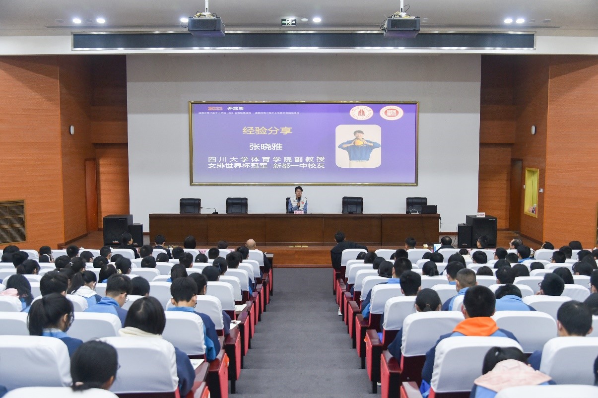 然后,体育学院副教授、女排世界杯冠军、新都一中杰出校友张晓雅老师回忆了她在新都一中生活、学习的美好时光,分享了她坚持日复一日刻苦训练、进入女排国家队为祖国荣誉而战、获得世界冠军的成长经历。张晓雅老师以中国女排“顽强拼搏、永不言败”的精神鼓励新都一中的学弟、学妹们要不畏困难、脚踏实地、为梦想努力、为祖国奋斗。同学们都深受鼓舞、倍感振奋。