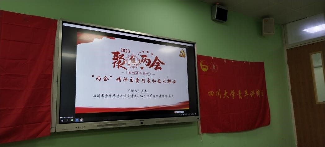 活动伊始,全体成员肃立,共唱共青团团歌。首先,青年讲师团成员罗杰博士于线上与大家进行思想上的交流。他从“两会”的概念、发展过程、开展流程、工作报告、目前的工作总基调、工作重点等方面进行了详细介绍,并鼓励大家更多、更广、更深地去了解国家时政,拓宽眼界、提高格局。