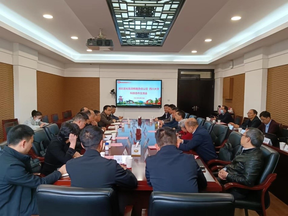 3月15日,在化工学院的前期推进下,我校与湖北宜化集团有限公司就共建联合创新研究中心合作事项在望江校区行政楼进行友好交流。湖北宜化集团党委书记、董事长王大真,总经理卞平官等,我校副校长褚良银,杰出教授钟本和,科研院副院长黄海,化工学院党委书记李天友、院长郭孝东、副院长唐盛伟、党委副书记李德富,王辛龙教授、李军教授等课题组专家参加会议。会议就共建联合创新研究中心的规划和举措进行了充分讨论。下一步,校企双方将以联合创新研究中心为平台,进一步深化产学研合作,加快关键核心技术攻关,强化原创性引领性研发布局。
