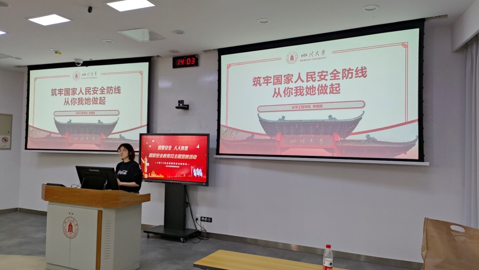 活动在主持人张洪的开场下拉开帷幕,先由辅导员李颖丽老师进行宣讲。李老师带领大家学习了国家安全相关法律法规,并通过讲解真实案例,教育同学们要规范网络使用行为,自觉维护网络空间安全,为总体国家安全建设贡献青春力量。