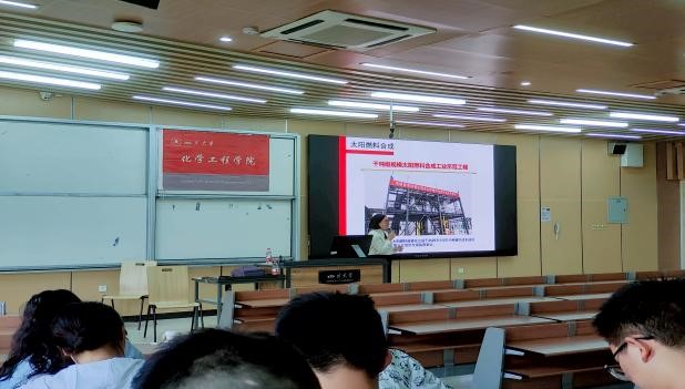 讲座伊始,周雪梅教授向同学们介绍了光催化技术在实现碳中和目标中的发展前景,面对全球范围内愈发严重的能源危机和环境问题,通过模拟自然界的光合作用,将太阳能高效地转化为化学能源的人工光合系统成为可持续能源领域的研究热点。随后向同学们讲解了光化学转化原理,即利用光催化剂,通过生物、物理、化学氧化等技术实现太阳能转化为化学能,接着周雪梅教授介绍了全球首套规模化液态太阳燃料合成项目,系统的向同学们展示了前沿的太阳能利用途径。