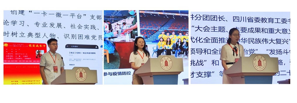 各高校样板党支部进行了“党的二十大”活动经验分享和成果展示。四川大学华西口腔医学院牙体牙髓研究生第二党支部王海溦同志分享了党支部“一卡一微一平台”的支部建设法。西南石油大学机电工程学院钻井提速科研团队党支部何灵同志阐明了“二十大精神赋能支部阵地建设、新征程赶考践行党员初心使命”的主题。成都中医药大学针灸推拿学院博士党支部李雪梅同志展示了“个人学·集体议·专家讲·榜样带·实践悟”五位一体的二十大精神学习模式。