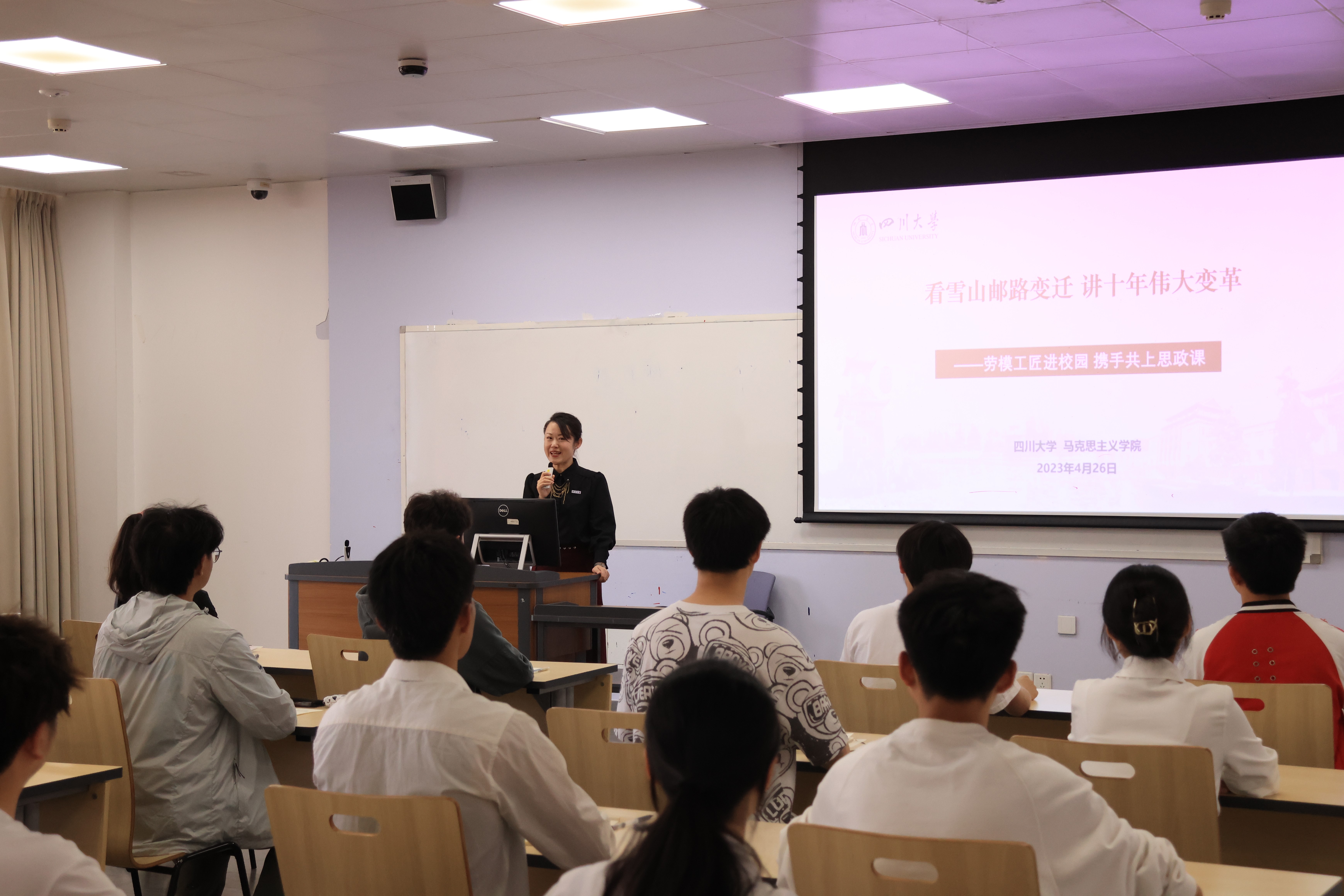王丽鸽老师则以其美多吉的人生经历为引子,精彩阐述了新时代10年的伟大变革,紧紧围绕“看雪山邮路变迁,讲十年伟大变革”主题进行授课。从身边的劳模工匠先进典型中汲取精神力量,既有活生生的案例,也有系统的阐述,在感受榜样的力量中倾听时代的变革,思政课由小见大的表达,引起了现场学子们的共鸣。江姐班学生邱天谈到,“个人成长和时代发展是相辅相成的,个人成长是时代发展的源动力,而时代发展为个人成长提供了机会。我们要将个人发展融入时代发展中,坚定中国特色社会主义道路,将自我革命融入到社会革命,我们要像其美多吉老师一样发扬钉钉子精神,将自己所学的化工专业知识融入到国家的化工企业,致力于祖国化工领域的发展,注入川大力量。”