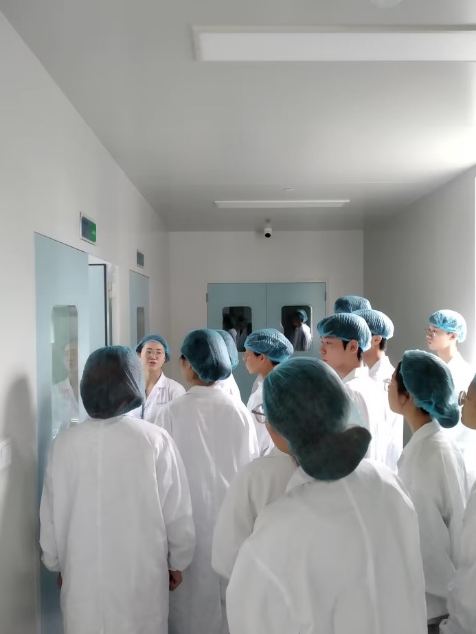 在揭牌仪式结束之后,生物工程专业的30余名同学在讲解员的带领下更换实验服进入公司研发车间参观。在讲解员的介绍下,同学们了解到柏奥特克疫苗研发中试车间按照2010版GMP标准设计和施工,净化车间面积约3300平方米,包括准备区、生物阳性区、纯化区、疫苗制备和分装冻干区,实现菌种制备、细胞制备、毒种制备、细胞培养、细菌发酵、初步纯化、精细纯化、分装冻干等功能。目前柏奥特克公司的冻干人用狂犬病疫苗(无血清Vero细胞)已取得Ⅲ期临床总计报告,正在筹备申报生产。