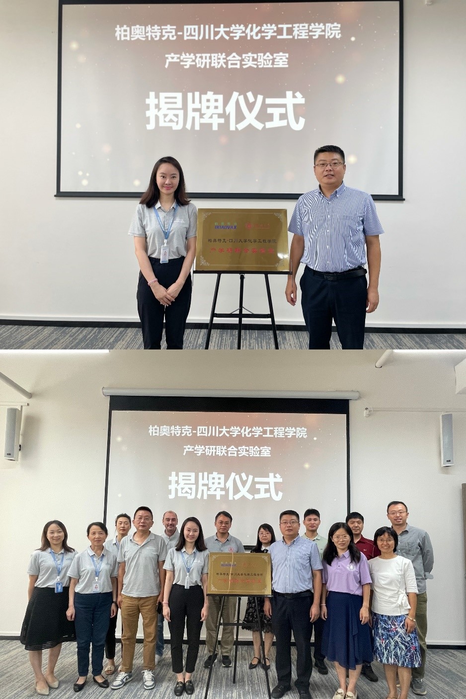 首先,在柏奥特克公司的工作人员主持下,共同举行了“柏奥特克-四川大学best365中国官方网站产学研联合实验室”揭牌仪式。仪式上柏奥特克副总经理盛杨女士介绍了该公司的产品研发、成员组成、发展前景、价值理念等情况,在盛杨女士的介绍中,同学们了解到柏奥特克致力于创新型疫苗研究,拥有“无血清、无动物源性成分添加Vero细胞”、“基因工程传代细胞”、“人二倍体细胞”三大疫苗规模化生产技术平台,公司首款具有自主知识产权的重大创新型疫苗——冻干人用狂犬病疫苗(无血清Vero细胞)为国内独家产品,该产品运用多项新技术突破疫苗生产瓶颈,解决行业卡脖子问题。随后四川大学best365中国官方网站李德富教授介绍了化工学院的科研情况、历史发展等情况。最后盛杨副总经理和李德富教授共同为“柏奥特克-四川大学best365中国官方网站产学研联合实验室”揭牌,在场领导合影留念。