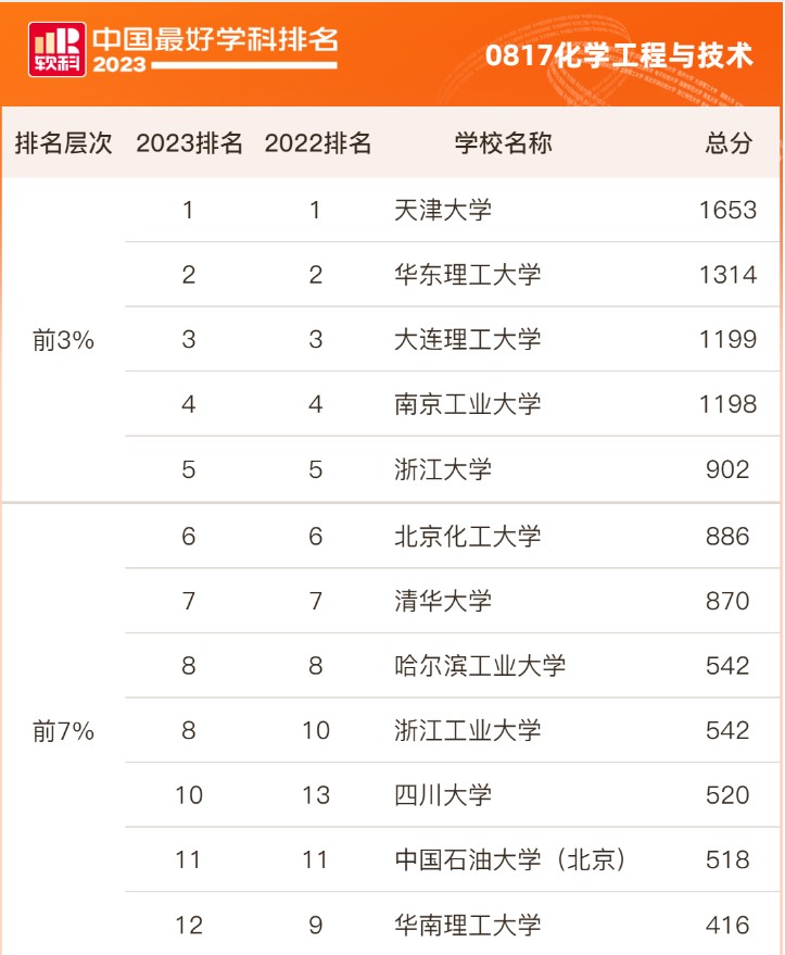 2023年11月8日,高等教育评价专业机构软科正式发布“2023软科中国最好学科排名”。四川大学“化学工程与技术”学科位列全国高校第10、综合类大学第4,在2022年全国第13的基础上再上新台阶,连续两年入选中国一流学科。