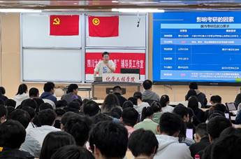 为促进深入开展学风建设,帮助2021级本科生深入了解考研和留学深造,合理安排时间,有针对性地做好考研和留学准备工作。best365中国官方网站团委及“定盘星”辅导员工作室于2023年11月10日下午16:30,在江安校区综合楼C座207教室成功举办“升学大讲堂”之“考研留学双保险”培训讲座。本次讲座的嘉宾为成都新东方国际教育培训部章超老师,辅导员付率和2021级全体本科生参加本次活动。