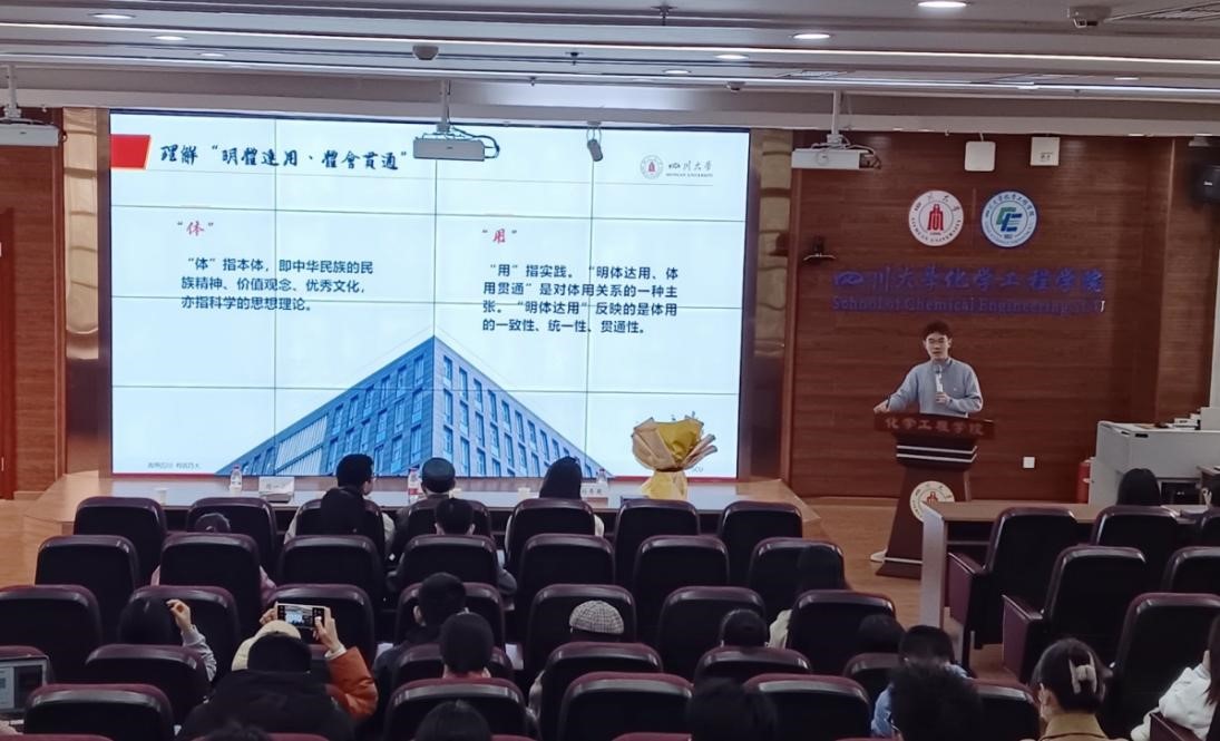 随后,四川省省委宣讲团代表周一山同学进行主题为“明体达用、体会贯通,为文化自信注入当代青年的蓬勃力量”宣讲,他带领我们深入理解了习近平文化思想“明体达用、体会贯通”的鲜明品格。周一山强调,青年是推动历史发展和社会进步的重要力量,我们更应坚定文化自信,铸牢爱国之心,积极传承发扬中华优秀传统文化。