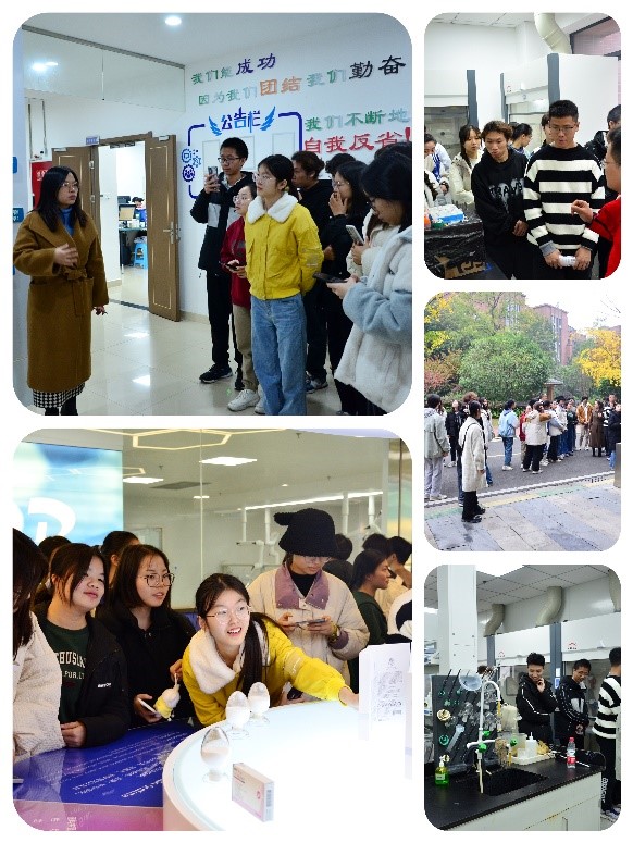 第二个参观的是四川澄华生物科技有限公司。在研发人员的讲解下,同学们了解到澄华生物主要以基因改造工程菌生产酶来进一步实现胆酸类和维生素类产品的生产,同时亦会结合化学合成法对众多产品的传统生产工艺进行颠覆式,如熊去氧胆酸的生产,过去常从熊胆中进行提取,但此类工艺成本耗费高且对环境不友好,目前该企业更多地采用以鹅去氧胆酸经化学法/双酶法生产的工艺路线。此外,研发人员还带领同学们参观了研发实验室内的相关仪器设备,如微孔道反应器、高效液相色谱仪及中试放大发酵罐等,让同学们对课程学习中接触过的设备有了更加直观的了解。