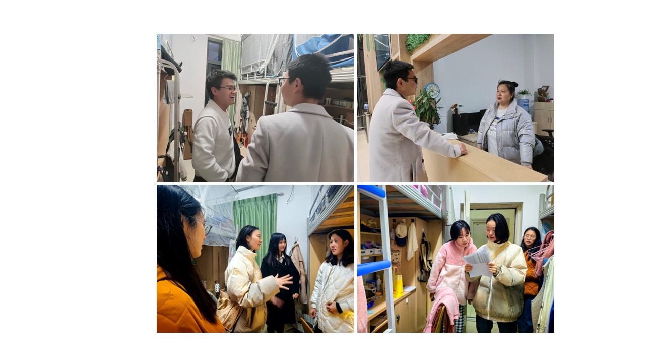 深入寝室,排查隐患。12月5日晚上,邓磊、杨秀英老师走进江安校区东园和西园学生宿舍,此次宿舍的重点是提醒同学们在宿舍一定要严格遵守宿舍管理规定,养成良好的科研生活习惯,避免夜晚外出。同时,也了解了学生在宿舍住宿情况,向同学们讲解了冬季在宿舍用电注意情况,不用使用违规电器,注意好寝室的卫生防护。此外,和负责学院学生的楼长阿姨针对目前学生宿舍存在的问题进行了交流,下一步也将对学生的出入寝室做好规范要求。