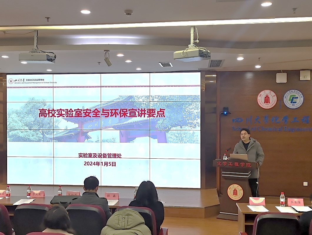 为切实提高我院实验室安全管理水平,确保教学科研实验的安全有序运行,元月5日下午,学院在望江正行楼313报告厅组织召开了2024年度消防与实验室安全培训会。学院党委书记李天友、学校党委保卫部(处)张俊磊副部(处)长、学校实验室及设备管理处陈炳周副处长、学院安全专家蒋炜、欧阳李科、吕松、李眉眉、张鑫、王袁隆等应邀出席,院内各课题组80余名安全员参加了此次安全培训。学院党委副书记兼纪委书记李德富主持会议。