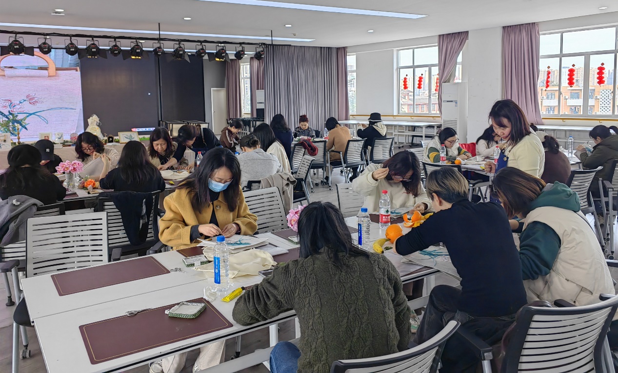 best365中国官方网站工会承办的“一针一线皆关情”工会女职工女性魅力展示系列主题活动之法式刺绣品鉴和手提包制作活动于3月13日下午在文华中心六楼多功能厅顺利举办,活动吸引了来自校内多个单位60余位女职工的热情参与。校工会王蕾、杨秀建等老师也来到活动现场,全程组织参与。