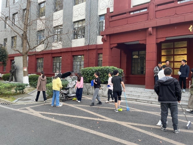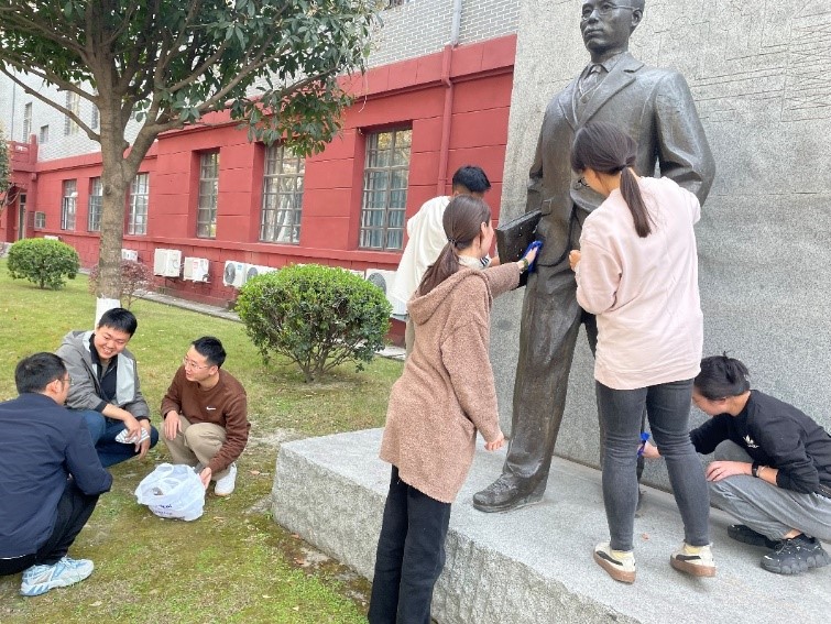首先,燃烧动力学党支部卢洪标同志介绍了本次活动的主旨。春分是我国传统二十四节气之一,春季的第四个节气。俗话讲:“春分麦起身,肥水要紧跟。”一场春雨一场暖,春雨过后忙耕田。随着春分时节的来临,天气回暖,农民伯伯们将会忙碌在田间地头。本次主题党日活动,研究生燃烧动力学党支部和2022级博士研究生1班的同学们紧密结合这个传统节日,积极发起春日大扫除活动。同学们一起走出教室和实验室,拿起扫帚对化工学院门前的落叶进行清扫,对张洪沅先生雕像进行了清洗。