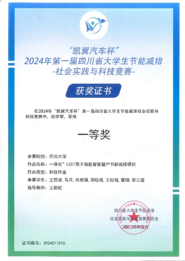 以上工作由过程装备与控制工程专业大三本科生马月与王赟波发表在高水平Materials Horizons期刊论文,两位本科生分别为论文一作与二作,王彩虹副教授为通讯作者。该科研工作基于本专业“课、赛、践、研”的项目制课程《动力与能源创新实践课》,实现了学生科研、创新、实践能力的全面培育。目前本研究所制备的智能窗户在第十七届全国大学生节能减排社会实践与科技竞赛,获得了校级一等奖与省级一等奖的殊荣,目前正在国赛的紧张备赛中,祝愿他们取得更好的成绩!