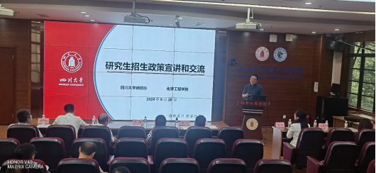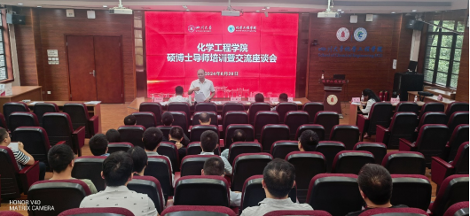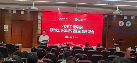 2024年6月20日下午,best365中国官方网站在望江校区化工楼313会议室举行硕博士导师培训及交流座谈会。学校研究生院招生办公室刘猛、研究生院招生办公室李洁科长、研究生院培养教育办公室黄云科长受邀出席活动。学院党委书记李天友、院长郭孝东、党委副书记兼纪委书记李德富、党委副书记姜利寒及硕博士导师50余人参加活动。会议由副院长谢锐主持。