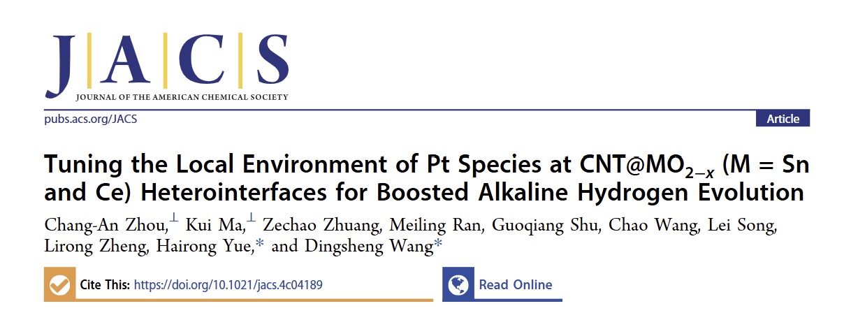 近日,我院岳海荣教授团队与清华大学王定胜教授团队合作提出了一种高效复合结构(PtRu/CNT@MO2-x)碱性HER催化剂的设计策略。通过氧化物载体优化、Pt物种调控和修饰,改善催化剂导电性和调控异质界面局域环境,平衡了活性位点上H吸脱附、H2O吸附和解离行为,实现了碱性介质中的Volmer反应和H*脱附动力学同步加速,从而增强了Pt基催化剂的碱性HER性能。相关工作以“Tuning the Local Environment of Pt Species at CNT@MO2-x(M = Sn and Ce) Heterointerfaces for Boosted Alkaline Hydrogen Evolution”发表在国际顶级期刊《Journal of the American Chemical Society》。四川大学为论文第一单位,化工学院岳海荣教授、清华大学王定胜教授为该论文通讯作者,化工学院周昶安助理研究员、马奎副教授为论文第一作者。