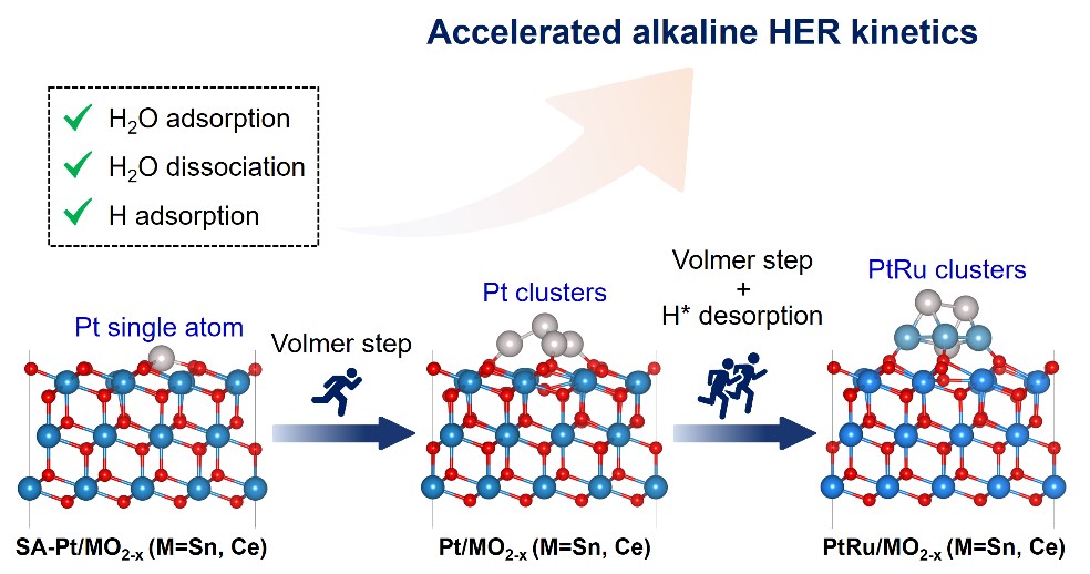 碱性析氢反应(HER)在清洁能源的转化和储存中起着至关重要的作用。然而,缓慢的动力学、高过电位和对贵金属(如Pt和Ru)的过度依赖导致制氢成本高昂,限制了碱性电解制氢的规模应用。针对碱性析氢体系的研究表明,调控催化剂的H2O吸附能、H2O解离能垒以及H吸附自由能对增强碱性HER活性具有关键作用。单一位点催化剂往往难以打破碱性HER关键中间体之间的制约关系,理想的碱性HER催化剂需要能够同时提升催化剂对水的吸附和解离能力,并具有适宜的H吸附作用。目前,多功能位点催化剂的构建还面临着各活性位点反应特性精准调控的难题,高效碱性HER催化剂的设计与开发仍存在挑战。