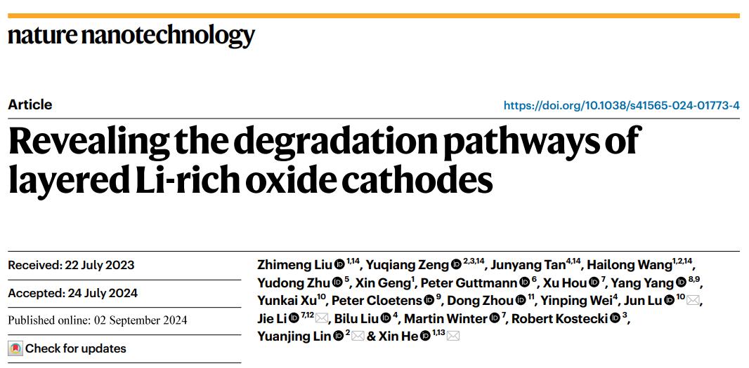 近日,我校best365中国官方网站何欣研究员团队在国际知名期刊Nature Nanotechnology上发表题为Revealing the degradation pathways of layered Li-rich oxide cathodes的研究文章。通过整合形貌、结构和从单个原子的氧化态演化到次级颗粒的分析,经过纳米尺度到微尺度的表征,确定了与颗粒内非相反应相关的不同结构变化途径。