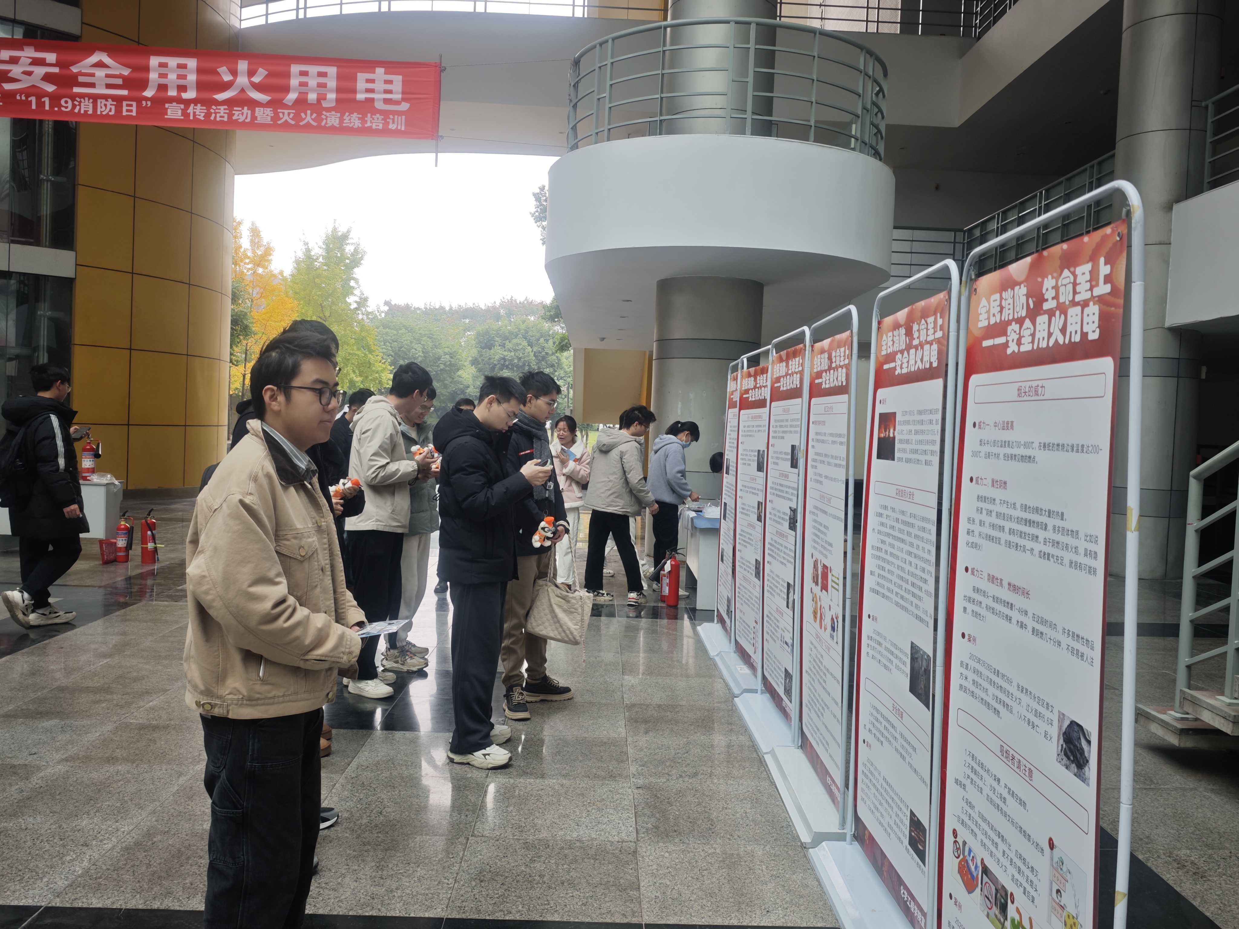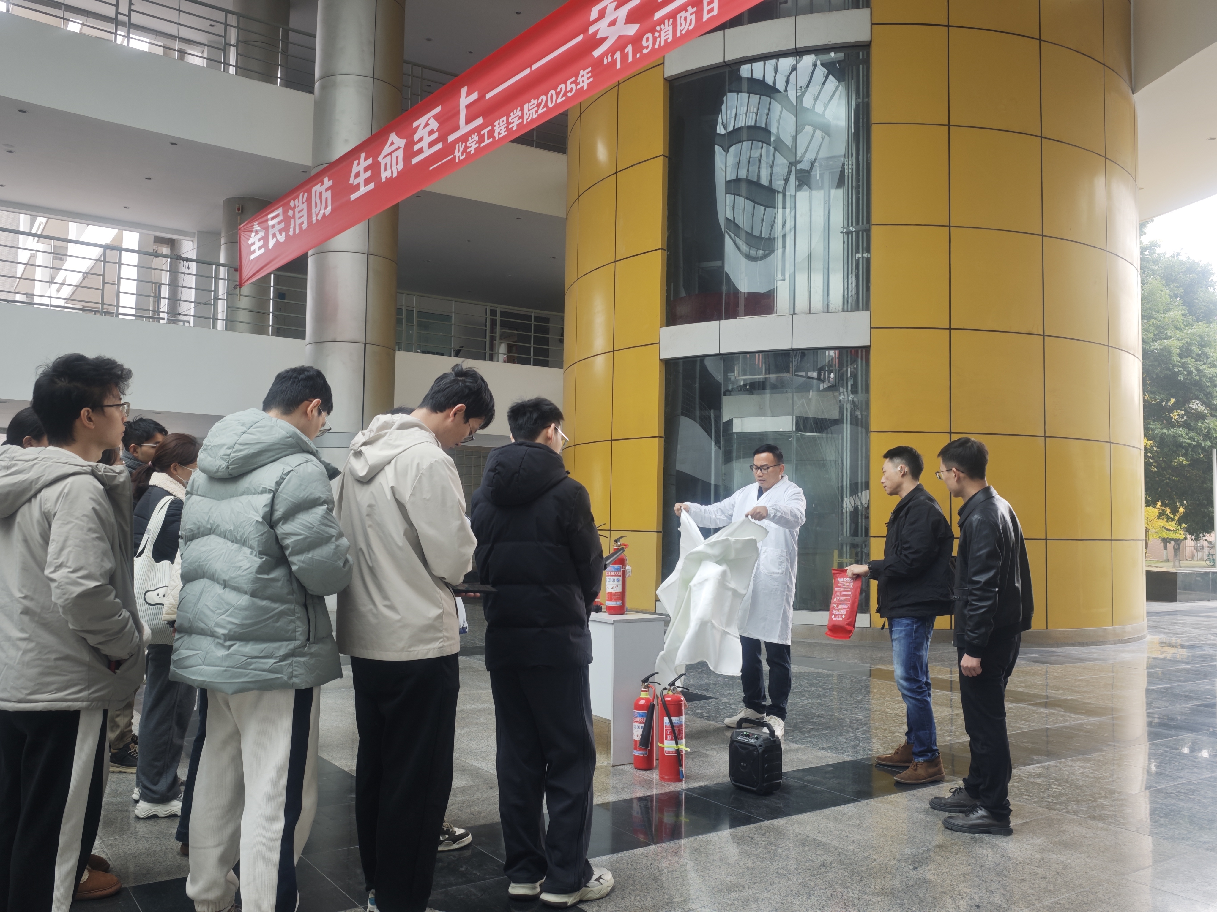 培训演练开始后,所有人员集合进入培训演练区域。利用“全民消防、生命至上----安全用火用电”的宣传展板,对师生们进行了“识风险、懂预防”的科普教育和趣味知识竞赛。王袁隆和胡毅老师对全体人员进行了相关消防技能讲解及演示,包括:火灾初期扑救,灭火器、防烟面罩、灭火毯实操使用等内容。