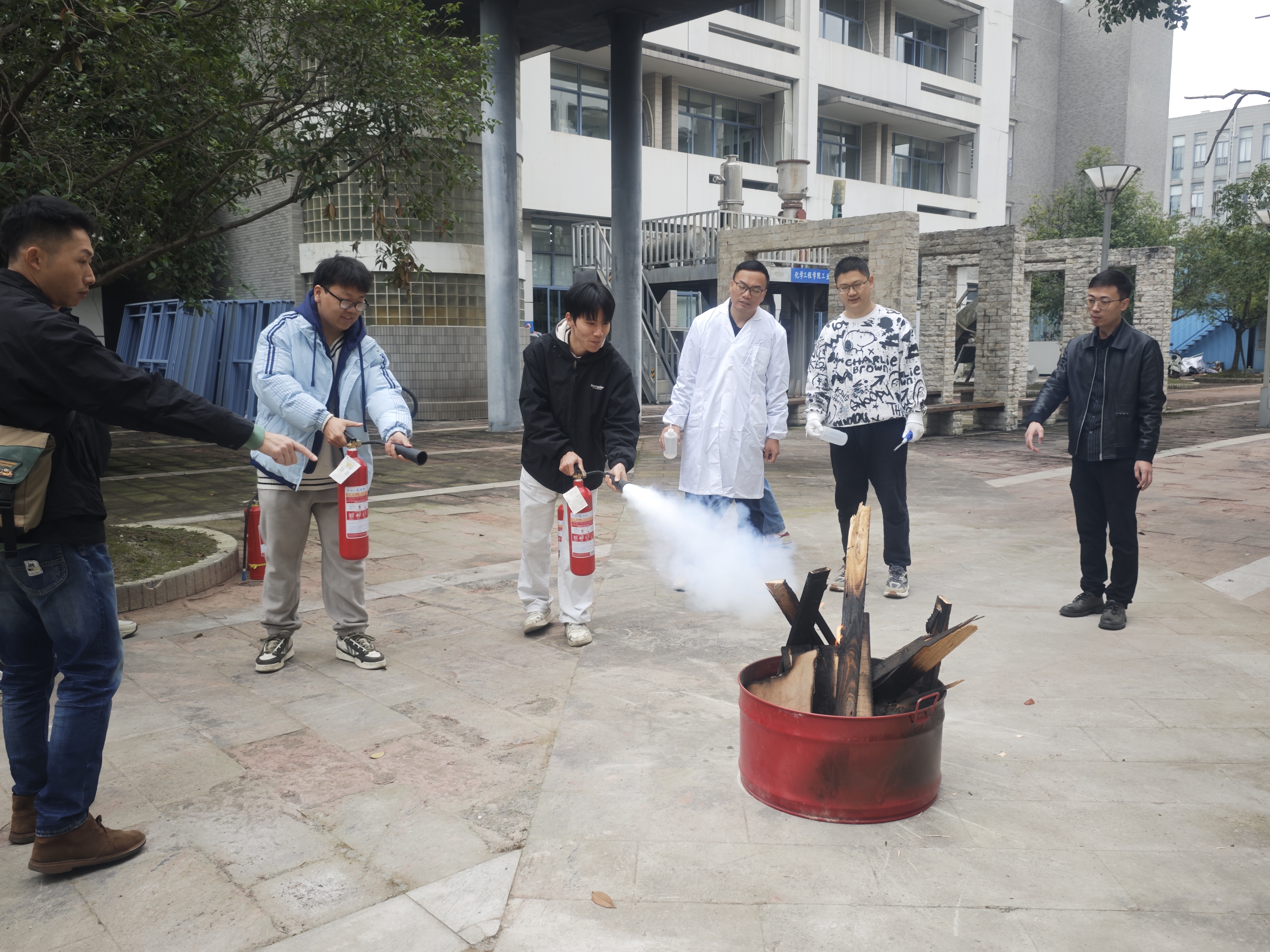 随后全体人员在演练场地集合,在王袁隆、胡毅老师和第三方安全服务公司工作人员的组织下井然有序的进行了灭火器灭火实操以及疏散逃生演练的学习和应用。全体人员均认真学习并进行实际操作,大家都受益匪浅。