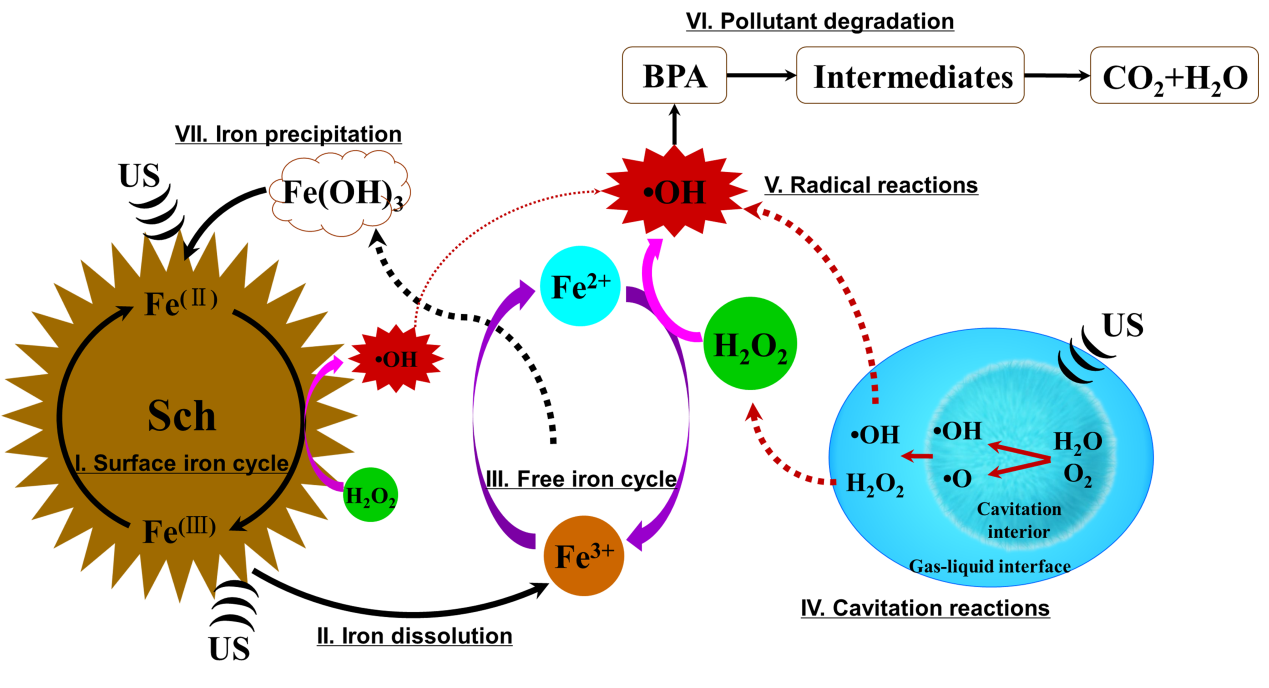 图2 超声-施氏矿物类芬顿系统降解双酚A的原理示意图