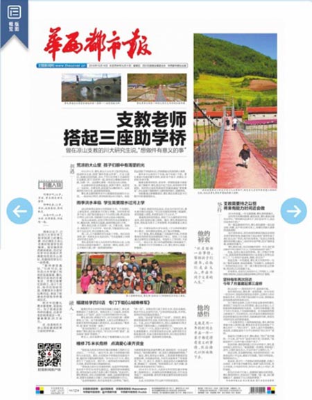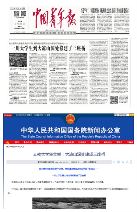 10月14日,《华西都市报》头版以《支教老师搭起三座助学桥——曾在凉山支教的川大研究生说,“想做件有意义的事”》为题报道了我校教育扶贫学生支教团优秀代表曹礼勇同学的感人事迹。旋即引发强烈反响,人民网、凤凰网、中国新闻网等众多主流权威媒体相继转载。据悉,此前《中国青年报》也曾以《一川大学生到大凉山深处修建了三座桥》报道支教团事迹,国务院新闻办官方网站还特别以“支教大学生壮举”为题对该报道全文转载。